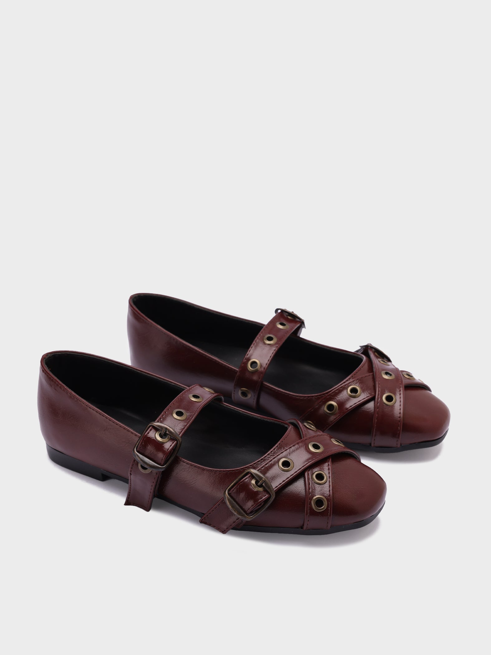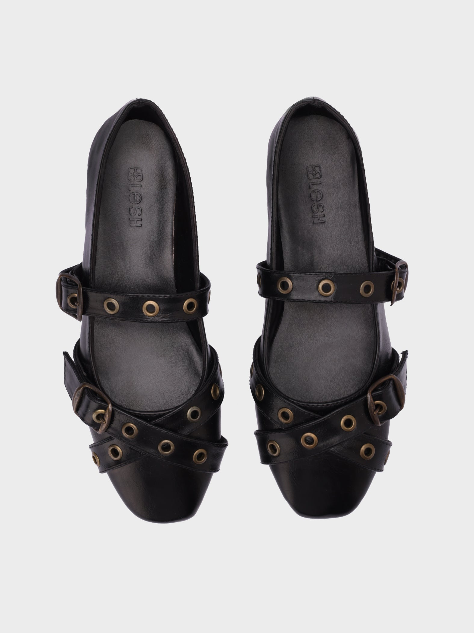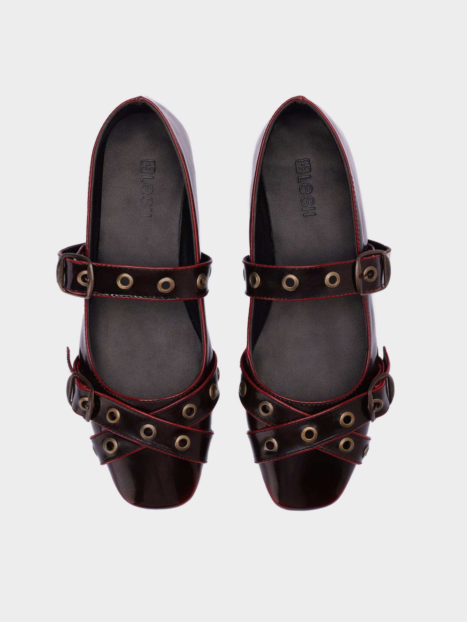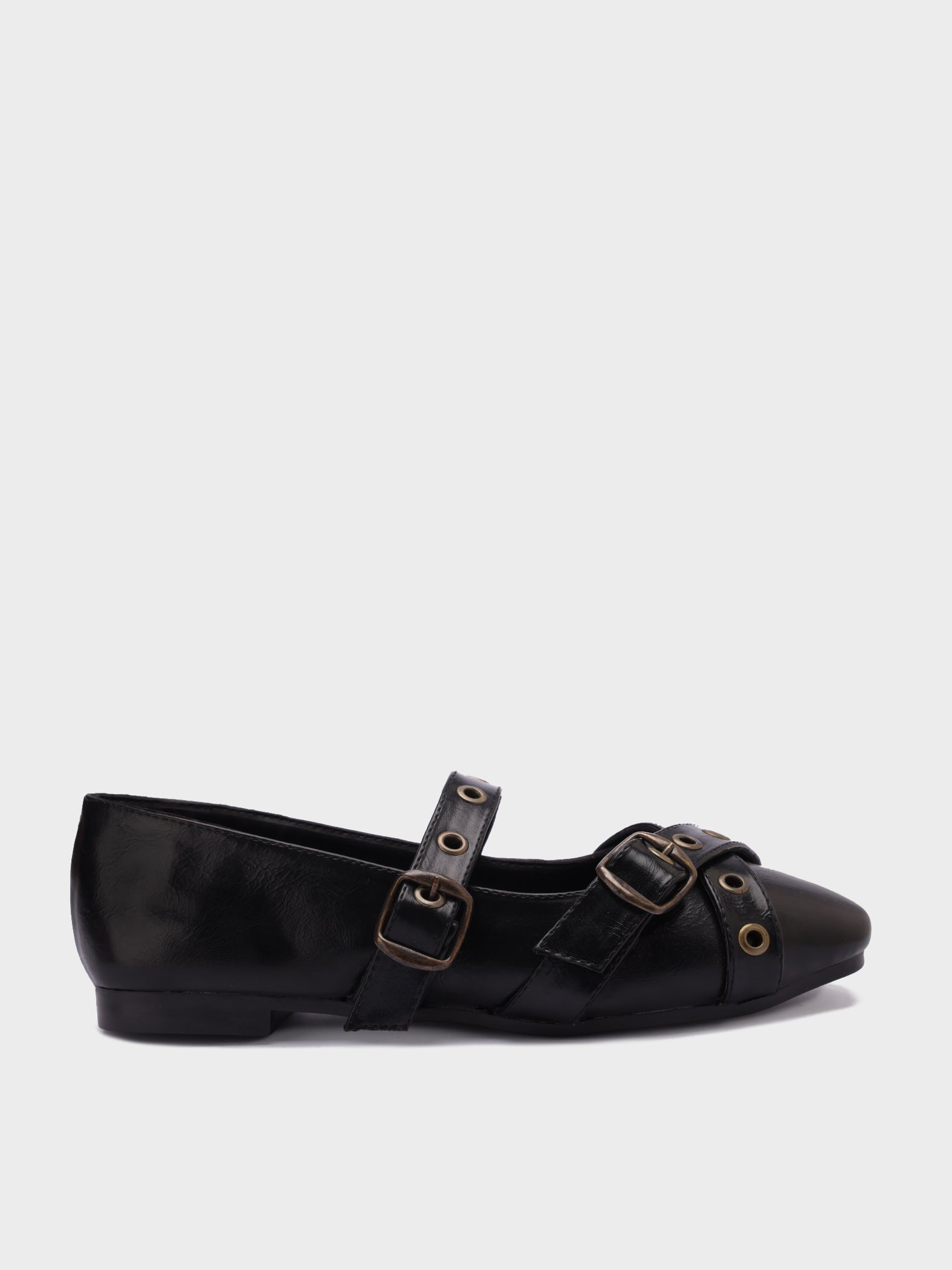 Edgy, bold, and full of attitude — these flats take the classic Mary Jane silhouette and flip the script. With double eyelet-embellished straps and oversized metal buckles, they channel heavy-metal hardware energy in the most wearable way. The square toe and patent finish add polish, while the contrasting trim keeps things punchy. Slip these on when you want to add grit to a minimal look — they don’t whisper, they roar.