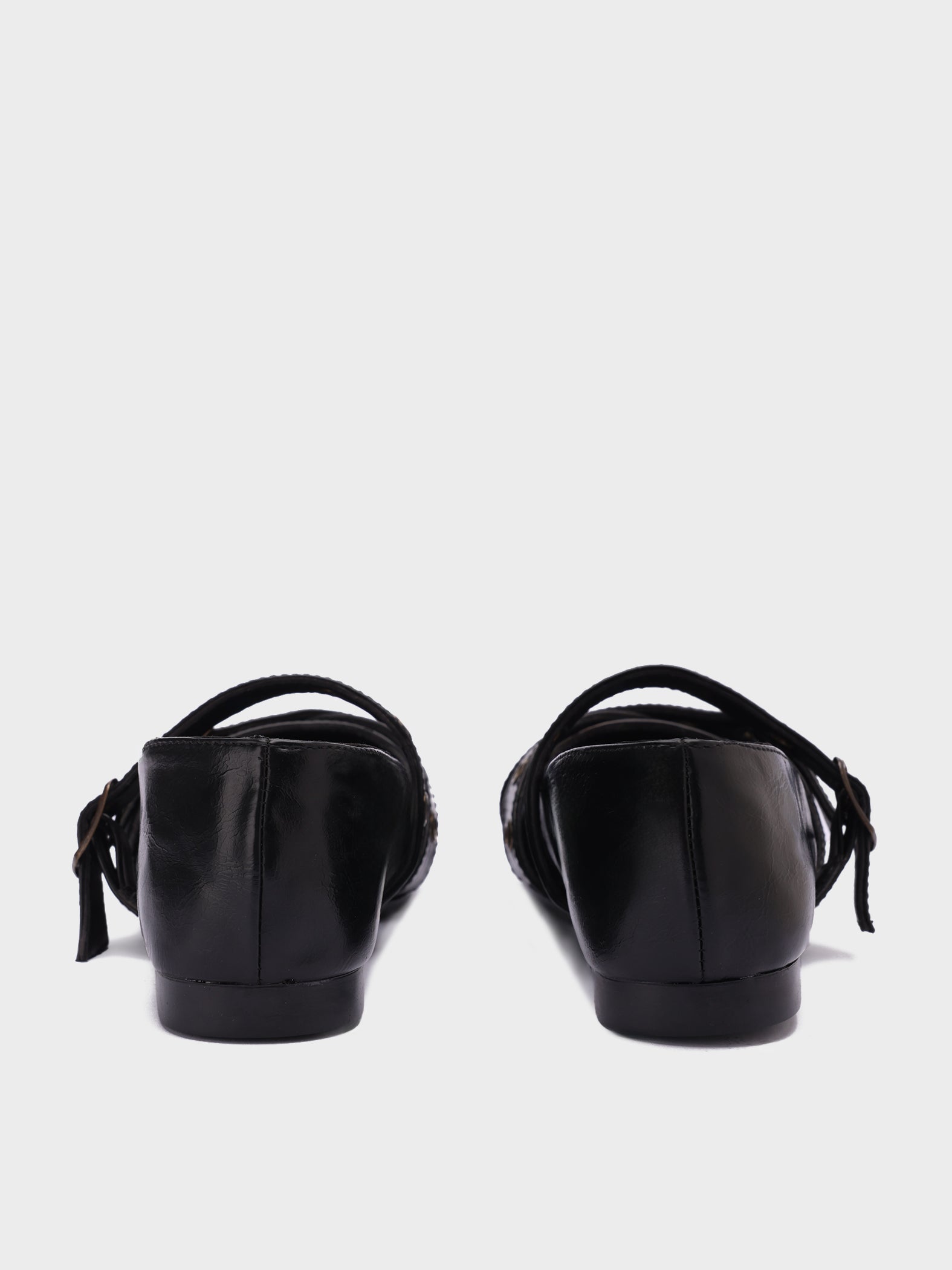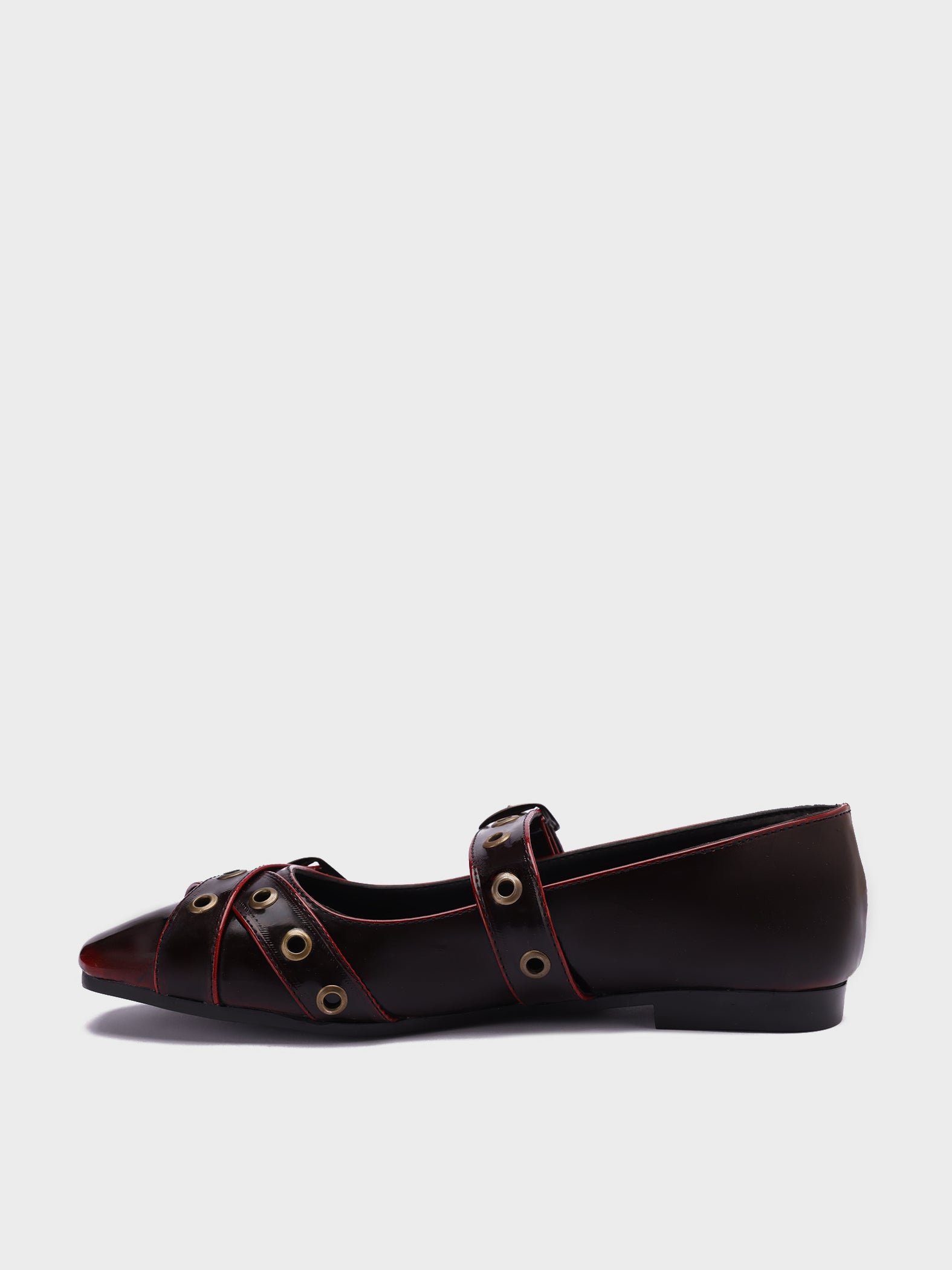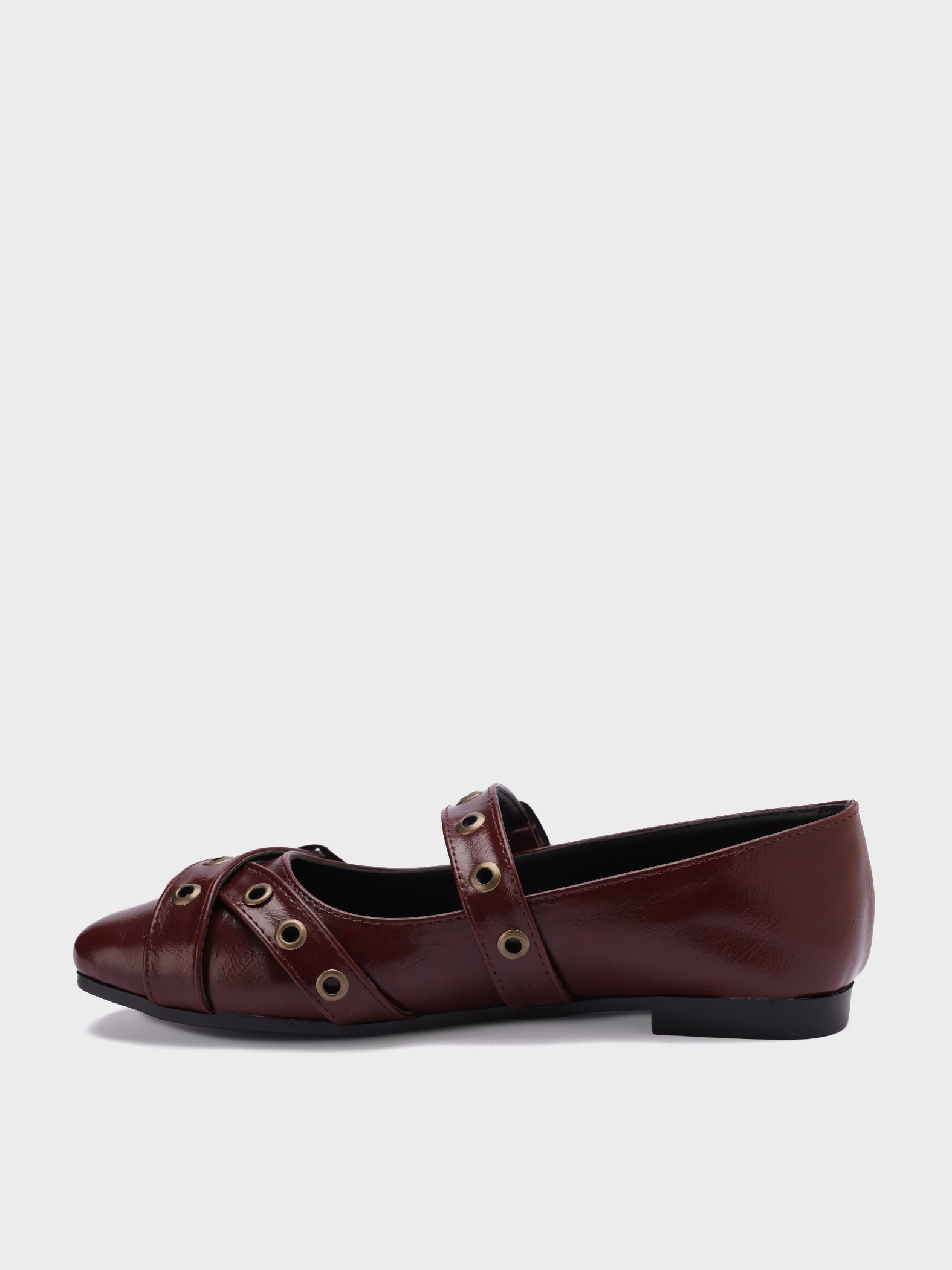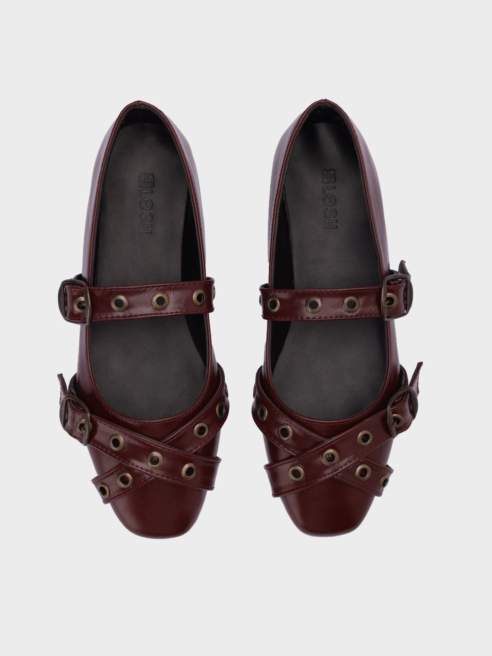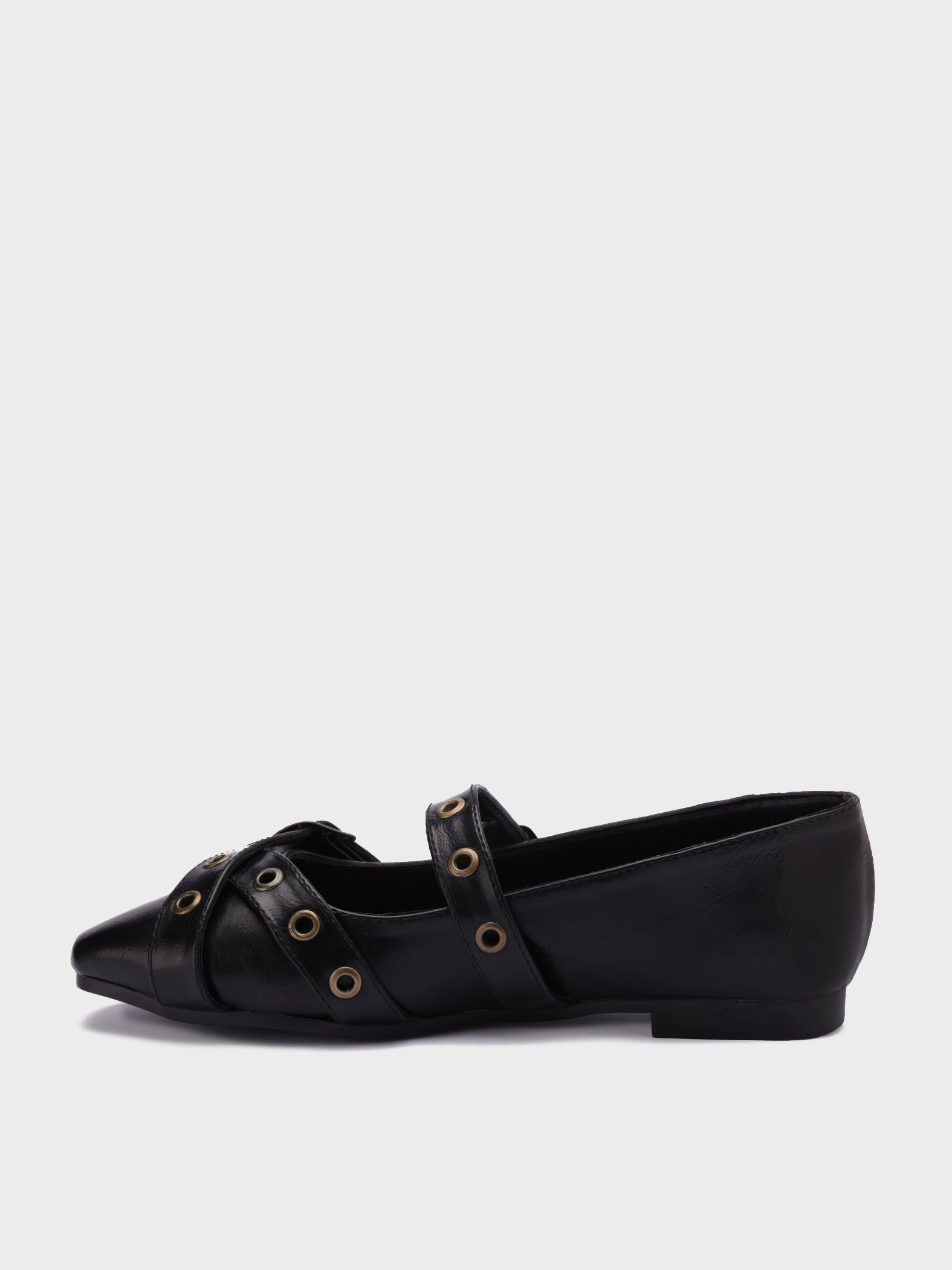 Edgy, bold, and full of attitude — these flats take the classic Mary Jane silhouette and flip the script. With double eyelet-embellished straps and oversized metal buckles, they channel heavy-metal hardware energy in the most wearable way. The square toe and patent finish add polish, while the contrasting trim keeps things punchy. Slip these on when you want to add grit to a minimal look — they don’t whisper, they roar.