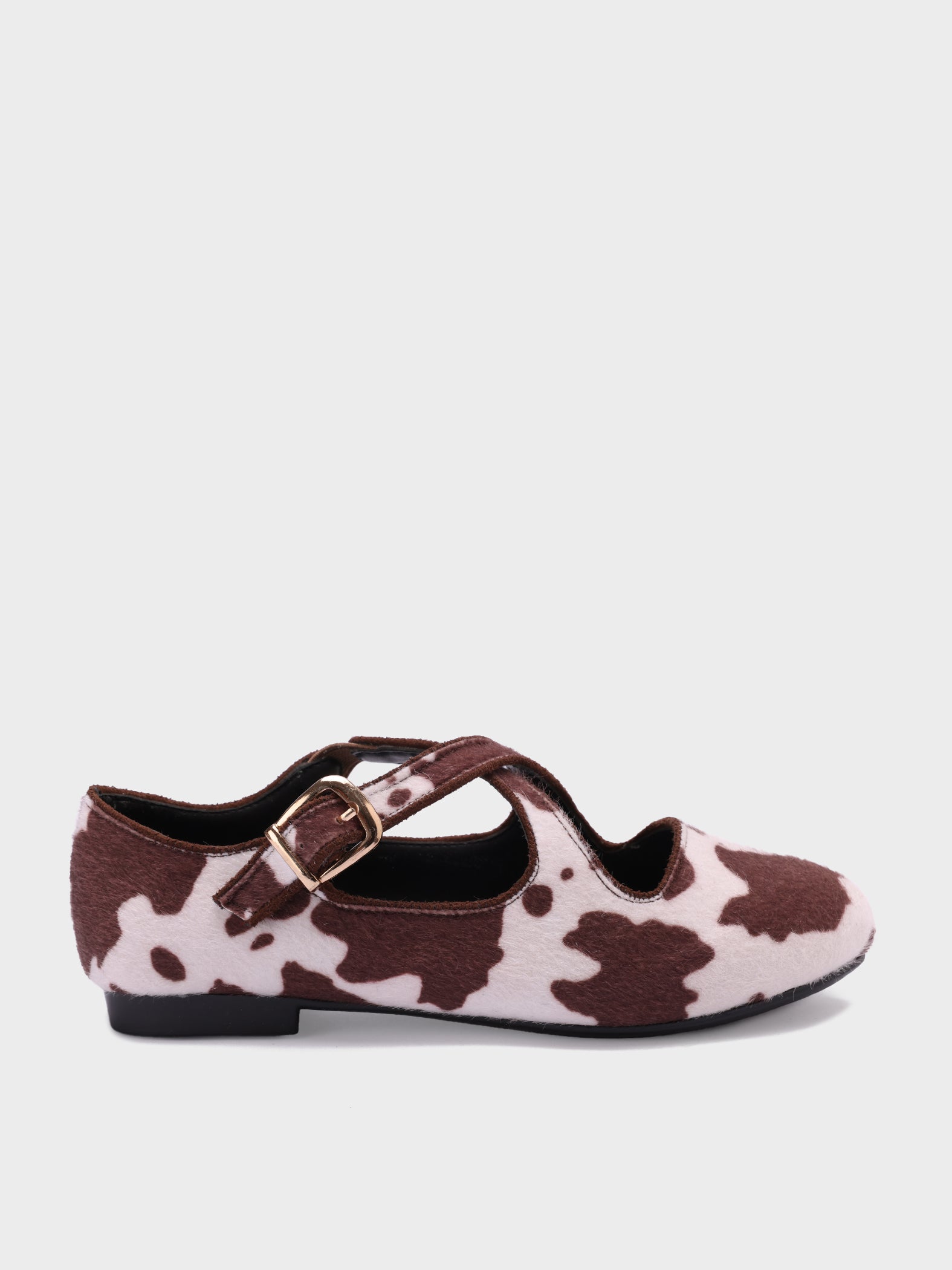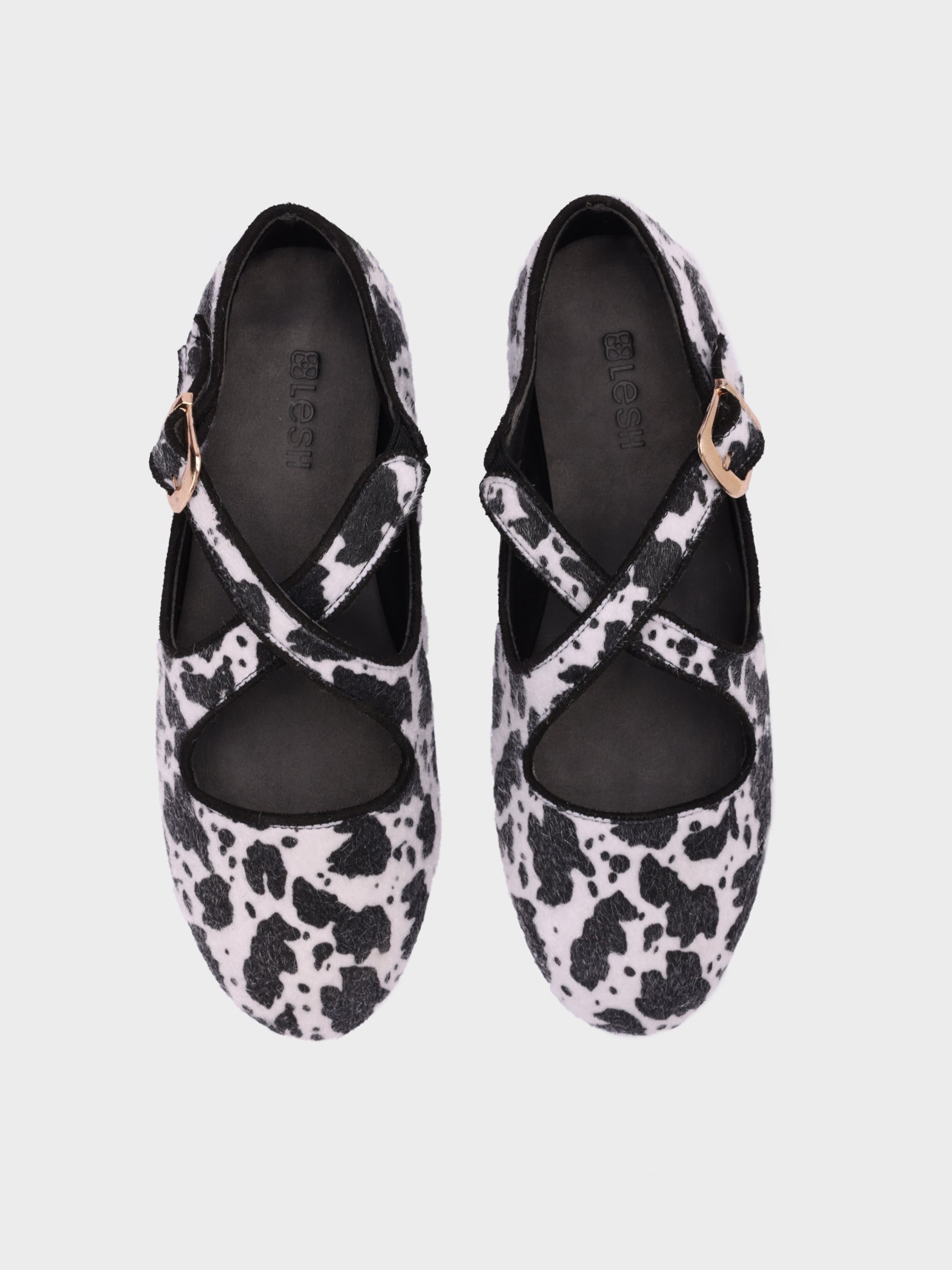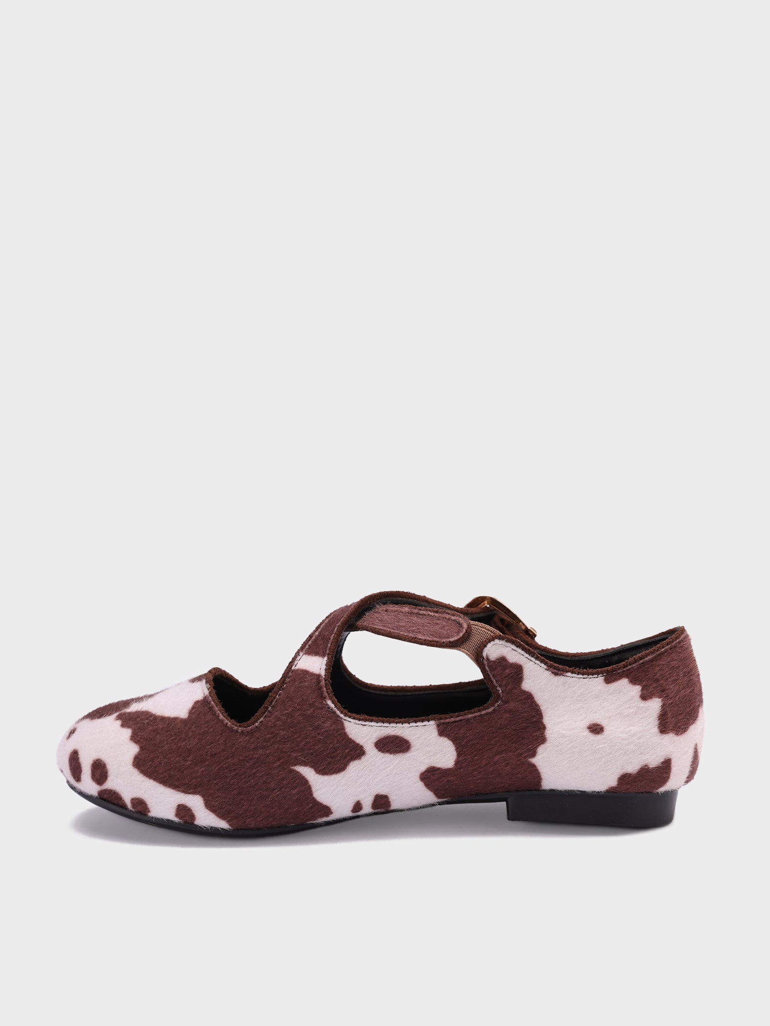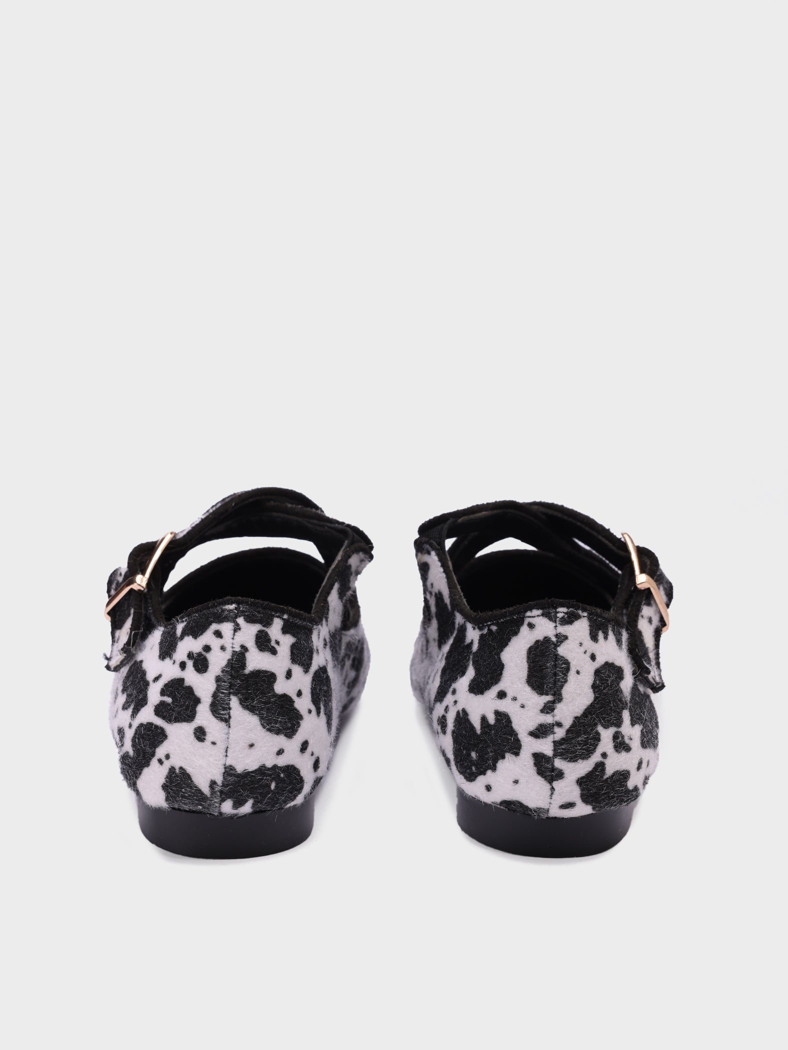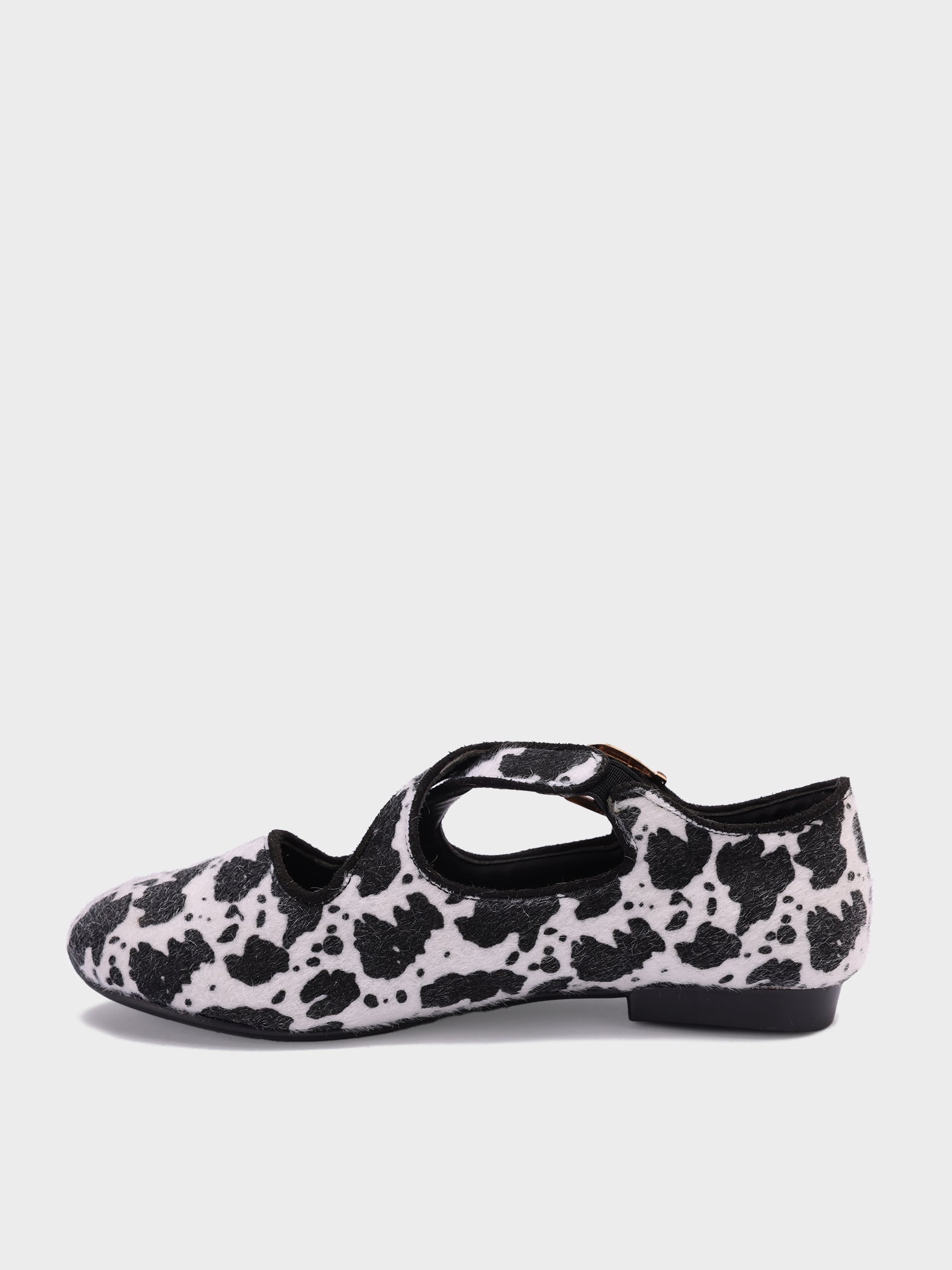 Simple, sleek, and just the right amount of wild  — these Mary Janes redefine classic charm with a bold twist. Crafted with soft cow-print texture and a sleek cross-strap design, they strike the perfect balance between playful and polished. The rounded toe and delicate gold buckle add a hint of retro flair, while the unique pattern brings personality to every step.