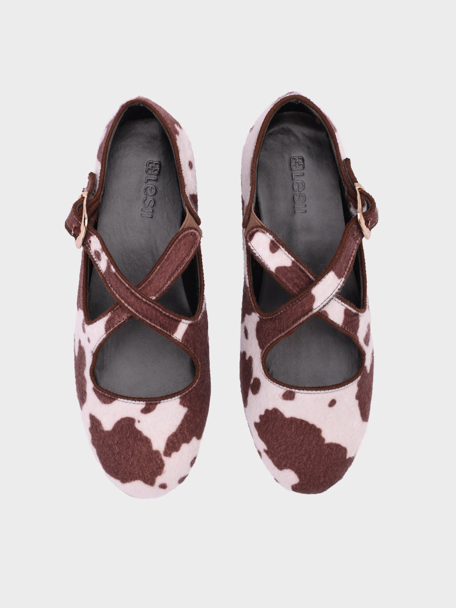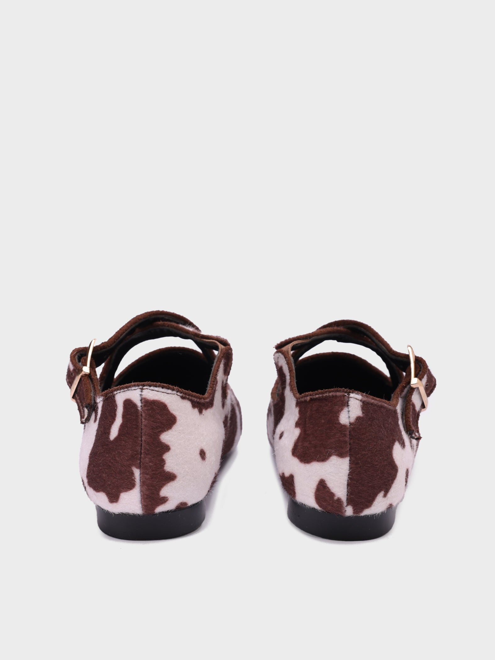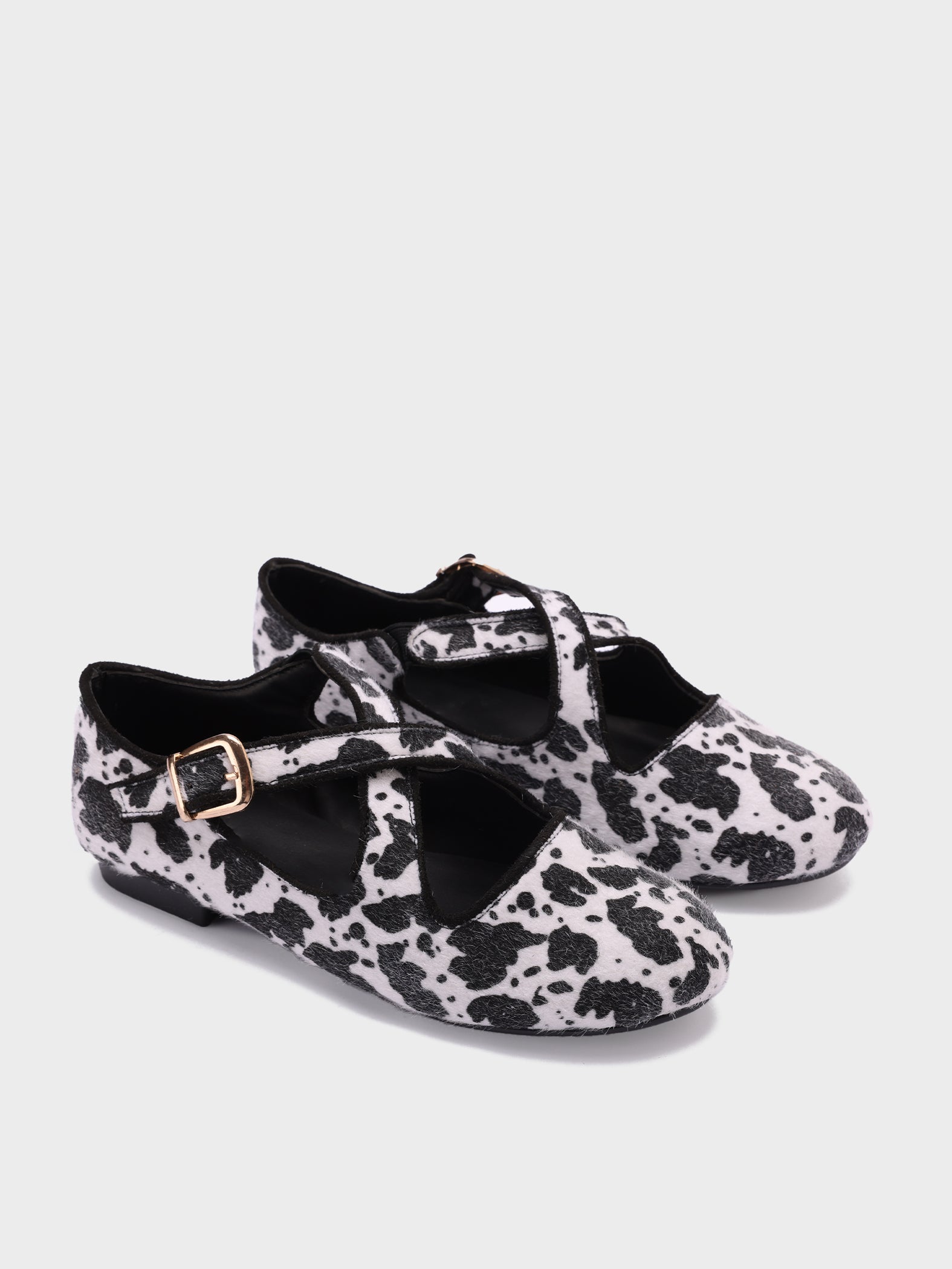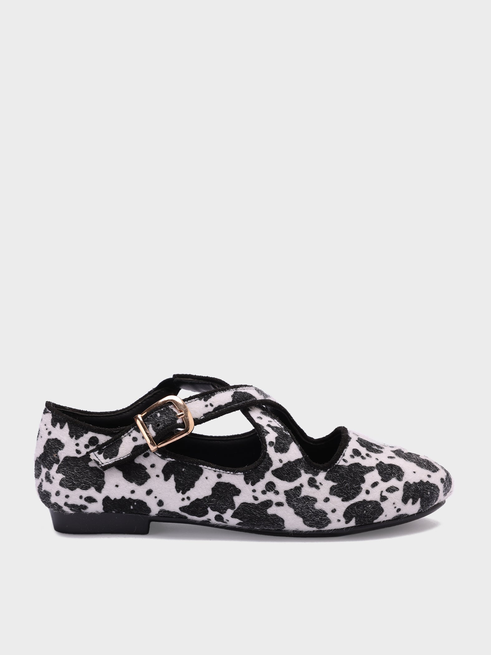 Simple, sleek, and just the right amount of wild  — these Mary Janes redefine classic charm with a bold twist. Crafted with soft cow-print texture and a sleek cross-strap design, they strike the perfect balance between playful and polished. The rounded toe and delicate gold buckle add a hint of retro flair, while the unique pattern brings personality to every step.