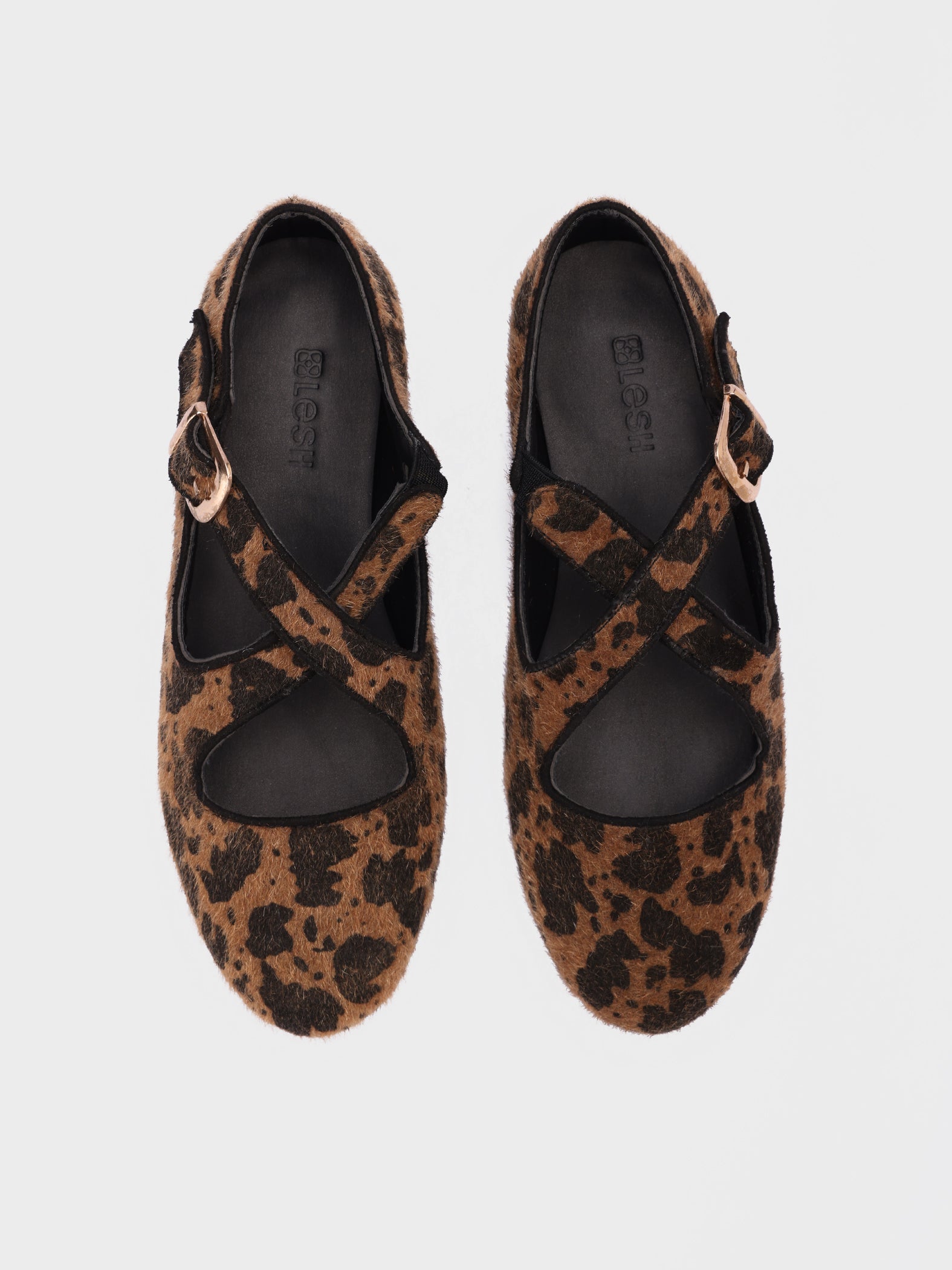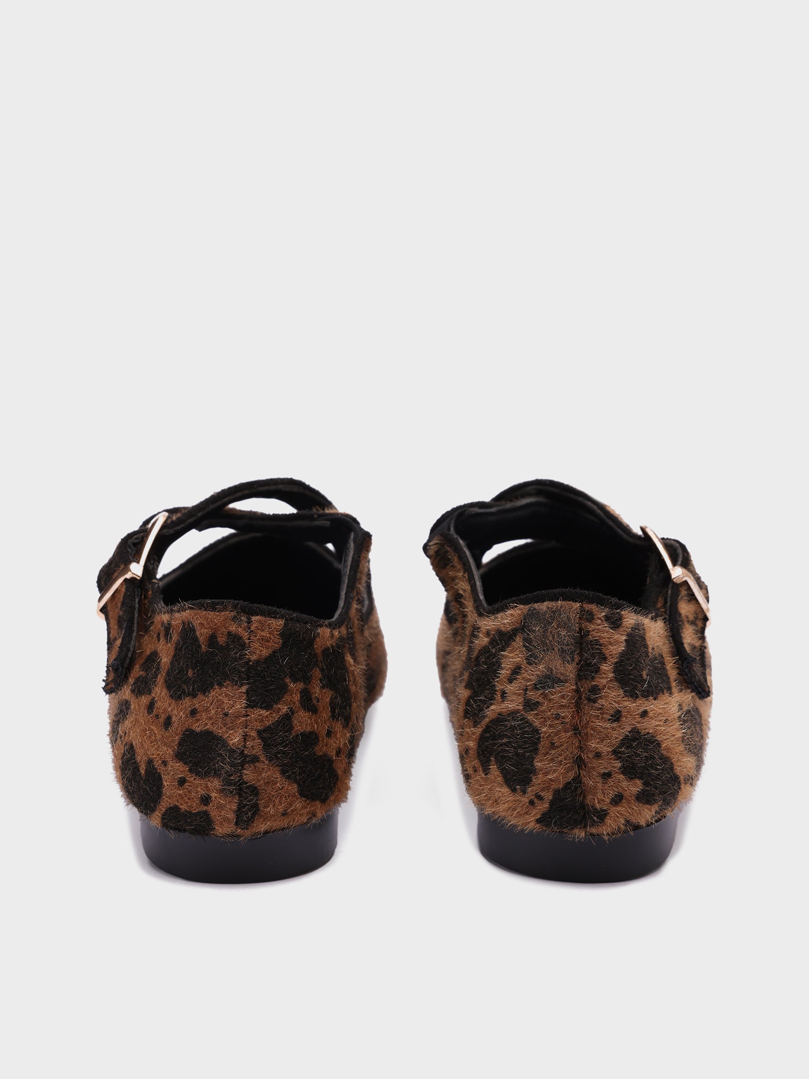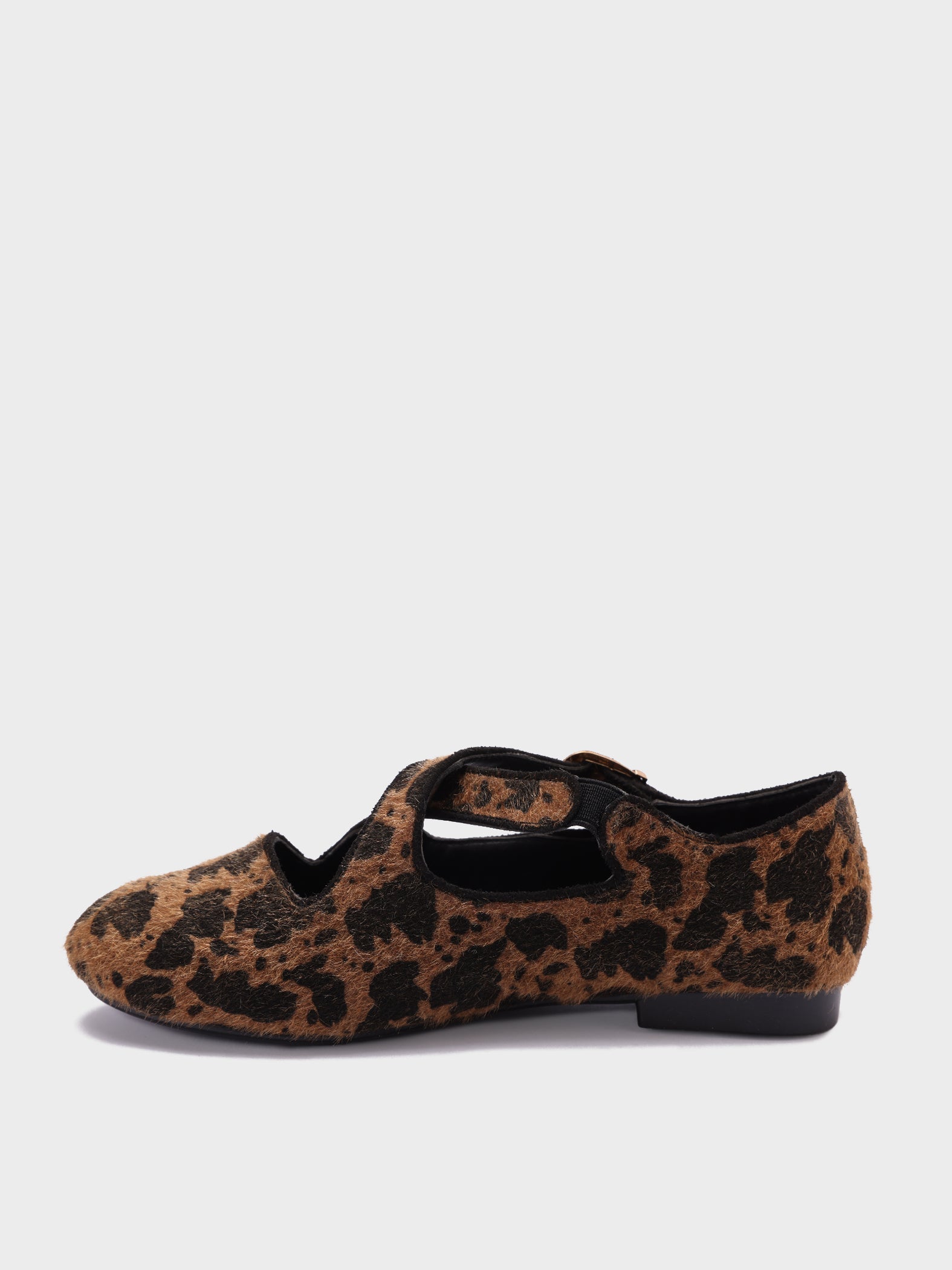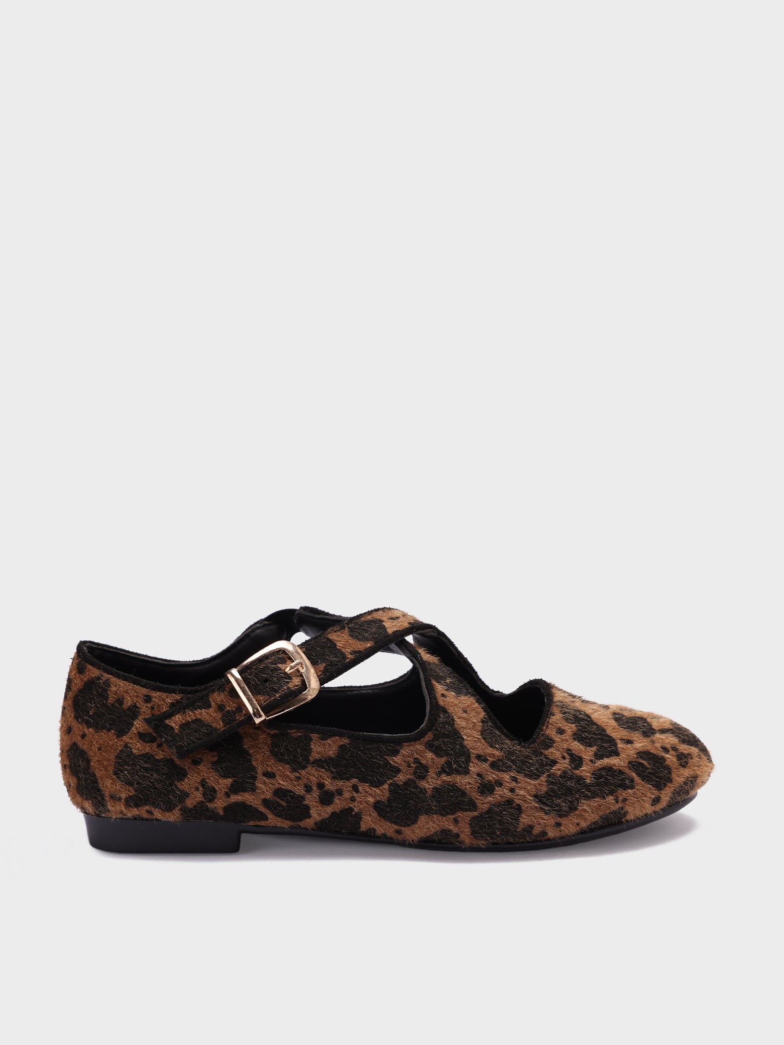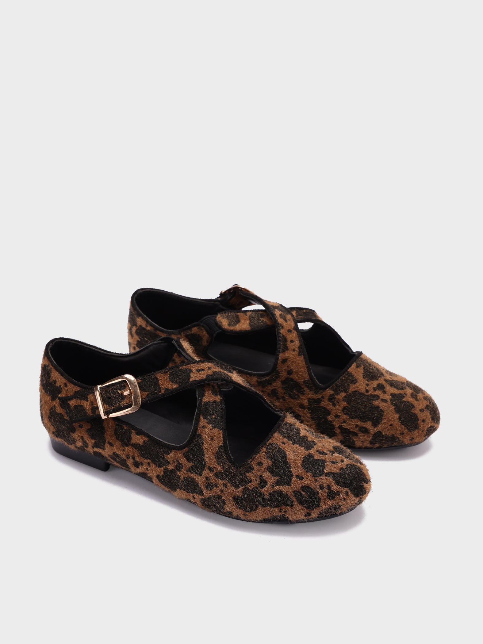 Simple, sleek, and just the right amount of wild  — these Mary Janes redefine classic charm with a bold twist. Crafted with soft cow-print texture and a sleek cross-strap design, they strike the perfect balance between playful and polished. The rounded toe and delicate gold buckle add a hint of retro flair, while the unique pattern brings personality to every step.