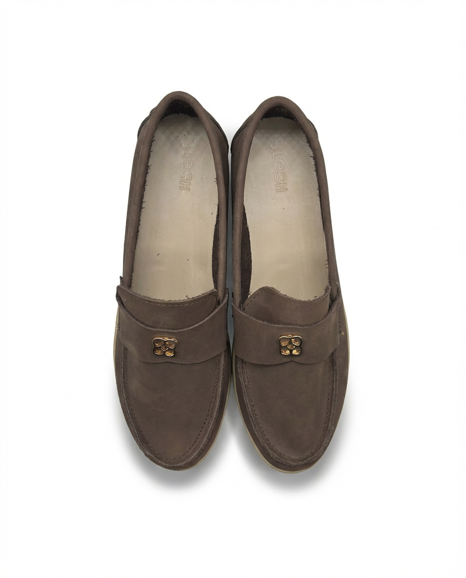 Crafted from natural suede leather, The LESH Loafers bring together timeless design and refined texture. Their soft suede finish offers a smooth, elegant look, while the minimalist silhouette and signature gold emblem add a touch of understated luxury.